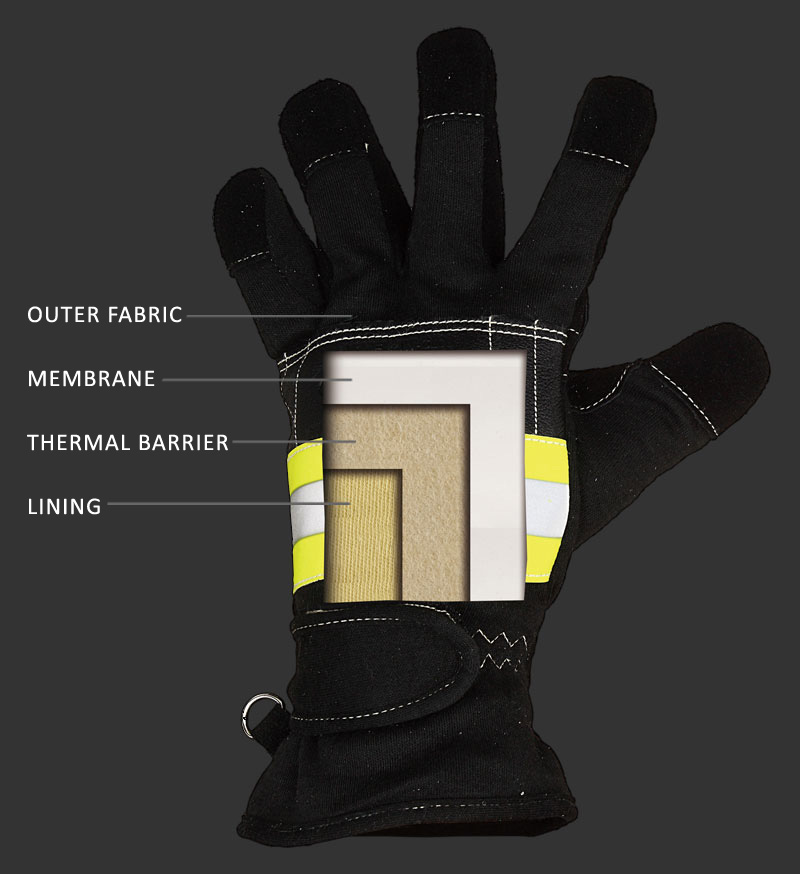 النسيج الخارجي تم صنع النسيج الخارجي للقفازات من جلد مقاوم للنار مصفح بنسيج مؤكسد وكيفلر . فهي مقاومة للنار ، مقاومة للقطع، مقاومة للتآكل ، وضد الإنزلاق ، ويزيد الحماية من المواد الخطرة الميكانيكية ولها مركب مقاوم وضد الحرارة.